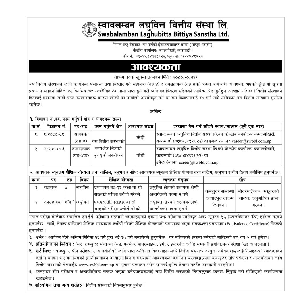 काठमाण्डौ । स्वावलम्बन लघुवित्त वित्तीय संस्था लिमिटेडले रोजगारको अवसर खुलाएको छ । कम्पनीको कार्यक्षेत्र भित्रको जुनसुकै कार्यालमा काम गर्न दरखास्त आह्वान गरेको हो ।