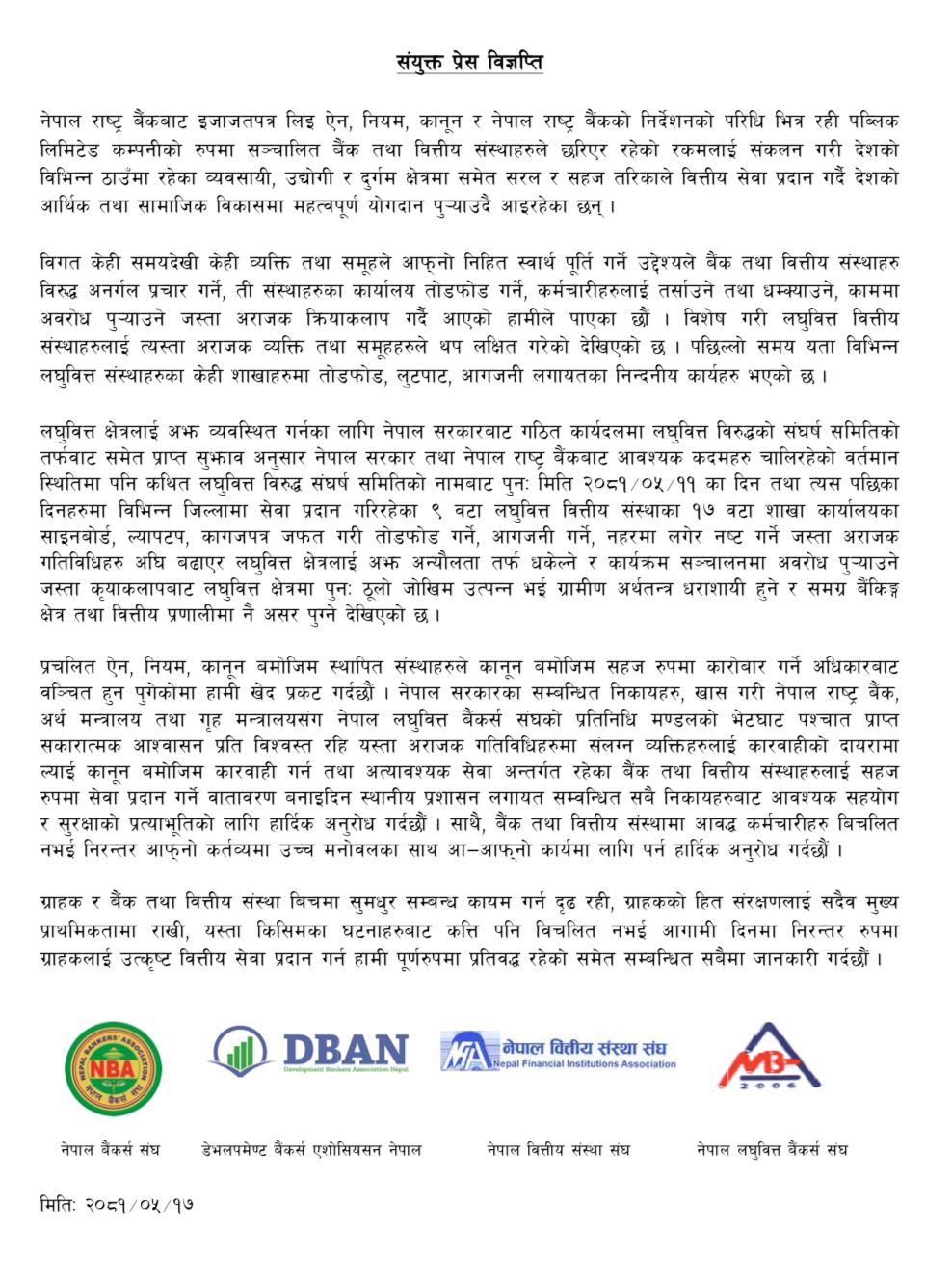 विज्ञप्तिमा भनिएको छ,‘लघुवित्त वित्तीय संस्थाहरुलाई त्यस्ता अराजक व्यक्ति तथा समूहहरुले थप लक्षित गरेको देखिएको छ । पछिल्लो समय यता विभिन्न लघुवित्त संस्थाहरुका केही शाखाहरुमा तोडफोड, लुटपाट, आगजनी लगायतका अराजक गतिविधि भइरहेको छ । यस्ता कार्यहरु निन्दनीय छन् ।’