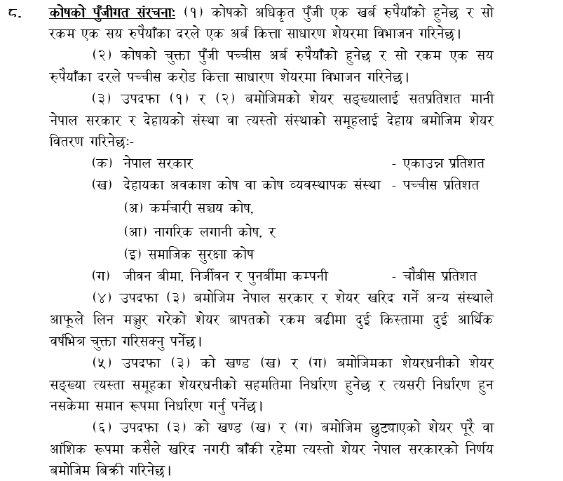 यदि, तोकिएका क्षेत्रहरुले शेयर लगानी नगरेमा नेपाल सरकार (मन्त्रिपरिषद)ले निर्णय गरेर शेयर बिक्री गर्न सक्ने गरी ऐनको मस्यौदामा प्रस्ताव गरिएको छ । अधिकृत पूँजीलाई २५ प्रतिशत मान्दा यस कोषबाट वार्षिक ४ खर्ब रुपैयाँ हाराहारीको विकासको काम गर्न सकिने विश्वास लिइएको छ ।