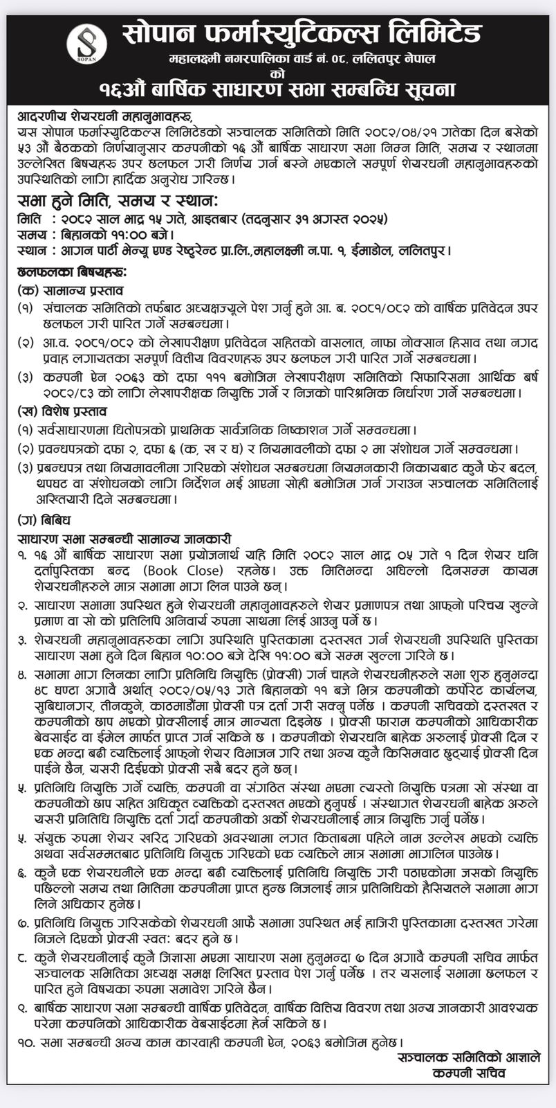 काठमाण्डौ । सोपान फर्मास्युटिकल्स लिमिटेडले साधारणसभा आह्वान गरेको छ। कम्पनीले भदौ १५ गते ललितपुरको इमाडोल स्थित आगन पार्टी भेन्युमा आर्थिक २०८१/८२ को साधारणसभा आह्वान गरेको हो।