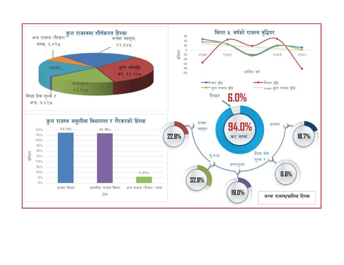 गत वर्षको तुलनामा पनि स्थिति कमजोर देखिएको छ। आर्थिक वर्ष २०८१।८२ मा वार्षिक लक्ष्य १४ खर्ब १९ अर्ब ३० करोड रहेको थियो भने कार्तिकसम्मको लक्ष्य ४ खर्ब ६ अर्ब ३७ करोड थियो। सो वर्ष कार्तिक ३० गतेसम्मको जम्मा सङ्कलन ३ खर्ब २९ अर्ब २ करोड मात्र थियो। कार्तिक महिनाको मात्र सङ्कलन ७६ अर्ब पुगेको थियो।