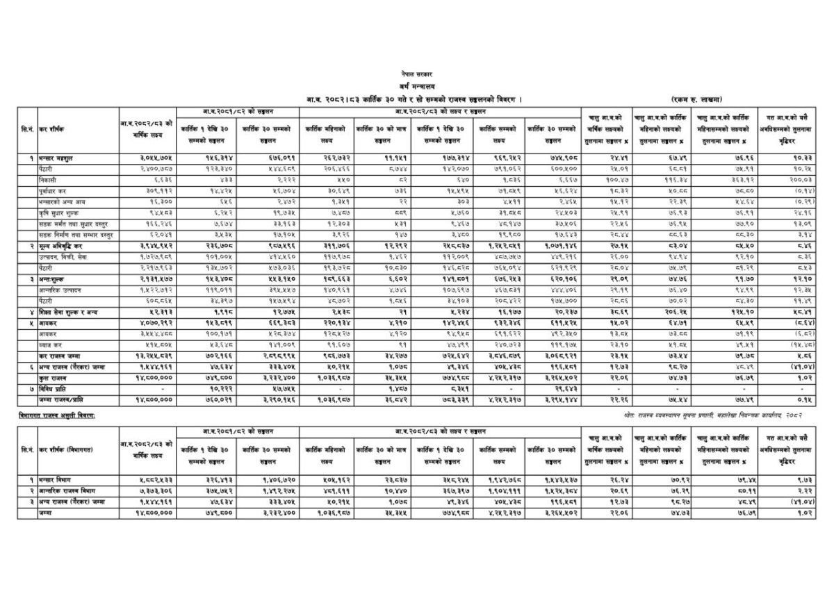 काठमाण्डौ । चालु आर्थिक वर्ष २०८२।०८३ को कार्तिकसम्मको राजस्व सङ्कलन लक्ष्यभन्दा कम रहेर सार्वजनिक भएको छ। राजस्व व्यवस्थापन महाशाखाका तथ्याङ्कअनुसार यस आर्थिक वर्षको वार्षिक लक्ष्य १४ खर्ब ८० अर्ब तोकिएको थियो। तर कार्तिकसम्मको लक्ष्य ४ खर्ब २५ अर्ब २३ करोड रहेकोमा जम्मा सङ्कलन ३ खर्ब २९ अर्ब ५१ करोड मात्रै भएको छ। यसअनुसार प्राप्ति प्रतिशत ७७.४९ प्रतिशतमा सीमित भएको छ।