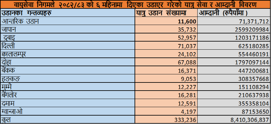 निगमले गत वर्षको पुससम्ममा २ लाख ५३ हजार यात्रुलाई उडाएर ६ अर्ब ९ करोड रुपैयाँ आम्दानी गरेको थियो । यस्तो आम्दानी चालु आर्थिक वर्षको सोही अवधिमा २ अर्ब ३२ करोड रुपैयाँले बढ्दा सबैभन्दा आकर्षक आम्दानीको स्रोत जापानको नारिता उडानमा देखिएको छ ।