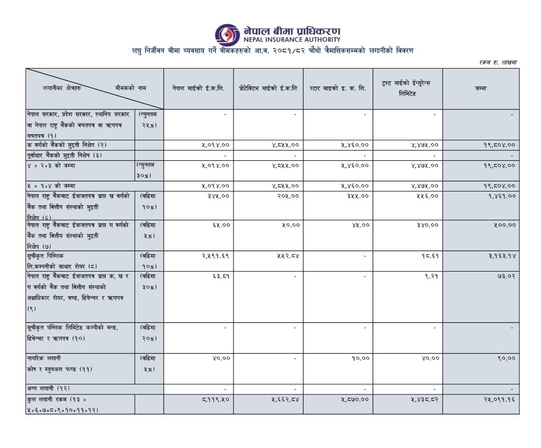काठमाण्डौ । हाल सञ्चालनमा रहेका ४ वटा लघु निर्जीवन बीमा कम्पनीले विभिन्न क्षेत्रमा २ अर्ब ५० करोड रुपैयाँ बढी लगानी गरेको देखिएको छ। नेपाल बीमा प्राधिकरणले सार्वजनिक गरेको तथ्यांकअनुसार आर्थिक वर्ष २०८२ /८३ को पहिलो त्रैमाससम्म लघु निर्जीवन बीमकले कुल २ अर्ब ५० करोड ९१ लाख रुपैयाँ लगानी गरेका हुन् ।