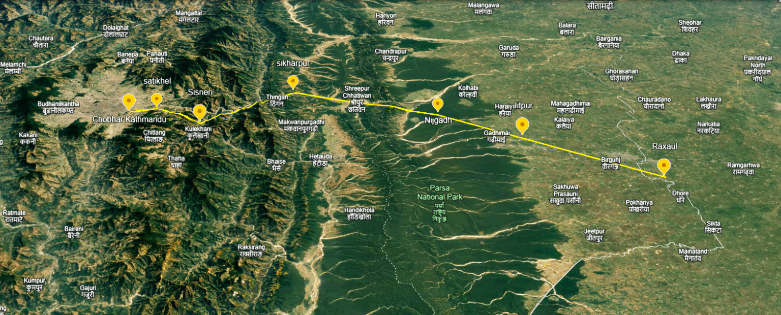 ब्रोडगेज रुट निर्माण भएपछि यो रुटमा अधिकतम प्रतिघण्टा १२० किलोमिटरको गतिमा रेल कुदाउन सकिनेछ । रेलमार्ग रक्सौलबाट सुरु भएर जितपुर, निजगढ, शिखरपुर, सिस्नेरी, साठीखेल हुँदै काठमाडौंको चोभारसम्म पुग्ने प्रस्ताव गरिएको छ ।