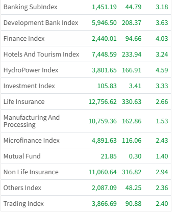 उच्च अंकले बजार बढ्दा नेप्से उपसमूहमा रहेका १३ वटै समूहमा हरियाली छाएको छ। आज जलविद्युत समूह सर्वाधिक ४.५९ प्रतिशतले बढेको छ।