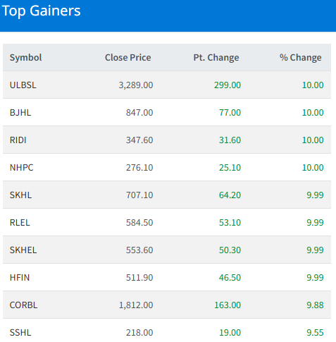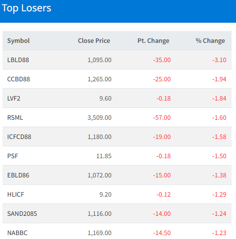 यो दिन रिलायन्स स्पिनिङ मिल्सका शेयरधनीहरुले सर्वाधिक गुमाए। यो कम्पनीको शेयरभाउ १.६० प्रतिशतले घटेको छ।