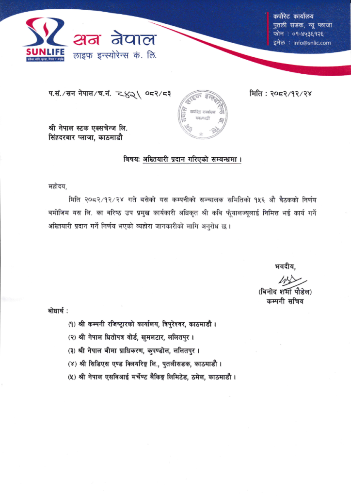 काठमाण्डौ । सन नेपाल लाइफ इन्स्योरेन्समा निमित्त प्रमुख कार्यकारी अधिकृतको जिम्मेवारी कवि फुयाँललाई दिइएको छ । चैत २४ गते बसेको सञ्चालक समितिले बैठकले फुयाँललाई निमित्त सिईओको जिम्मेवारी दिने निर्णय गरेको हो ।