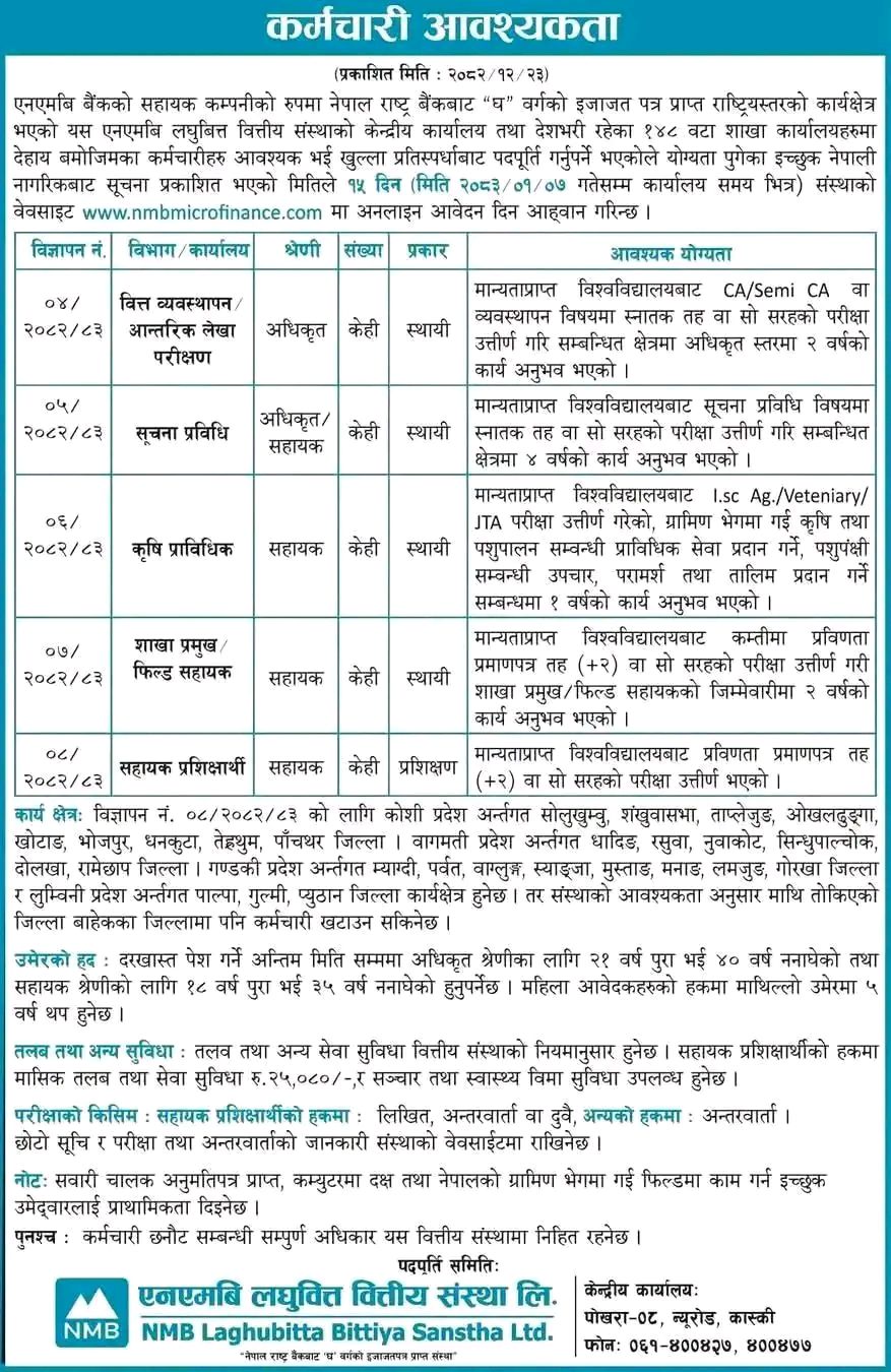 काठमाण्डौ । एनएमबि लघुवित्त वित्तीय संस्थाले विभिन्न पदका लागि कर्मचारी माग गरेको छ । लघुवित्तले वित्त व्यवस्थापन, आन्तिरिक लेखा परीक्षण विभागमा अधिकृतका लागि केही, सूचना प्रविधि विभागमा अधिकृत सहायकका लागि केही, कृषि प्राविधिक विभागमा सहायकका लागि केही, शाखा प्रमुख विभागमा सहायकका लागि केही र सहायक प्रशिक्षार्थी विभिागमा सहायकका लागि केही संख्यामा कर्मचारी माग गरेको हो । ईच्छुक तथा योग्यता पुगेकाले सूचना प्रकाशित भएको मितिले १५ दिनभित्र आवेदन दिनुपर्नेछ ।