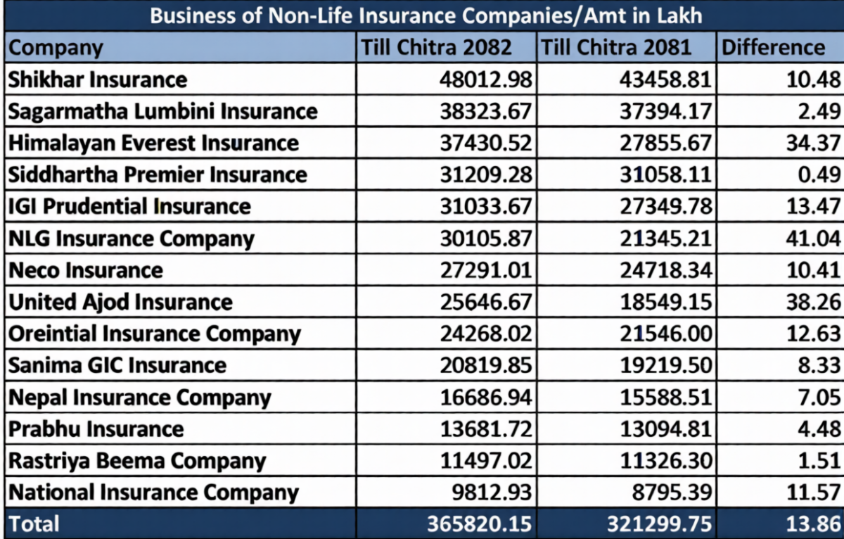 अघिल्लो आर्थिक वर्ष २०८१।८२ को चैतसम्म कम्पनीहरुले २१ लाख ३५ हजार २३३ वटा बीमालेख जारी गरेर ३२ अर्ब १२ करोड ९९ लाख रुपैयाँ कुल बीमाशुल्क आर्जन गरेका थिए। अघिल्लो वर्षको तुलनामा समीक्षा अवधिमा कम्पनीहरुको व्यापार १३.८६ प्रतिशतले बढेको छ।अघिल्लो वर्षको तुलनामा चालु वर्षको चैतमा १४ वटै बीमकको व्यापार बढेको छ। चैतसम्म शिखर इन्स्योरेन्सले सर्वाधिक व्यापार भित्र्याउँदा भने व्यापार वृद्धिको हिसाबले एनएलजी इन्स्योरेन्स अगाडि रहेको छ।