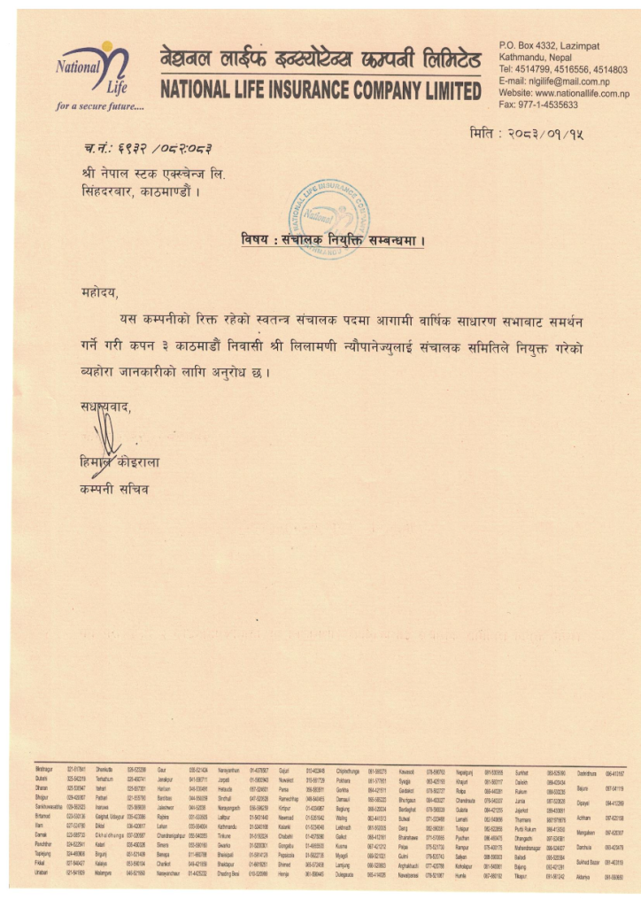 • नेशनल लाइफ इन्स्योरेन्सको स्वतन्त्र सञ्चालकमा न्यौपाने नियुक्त