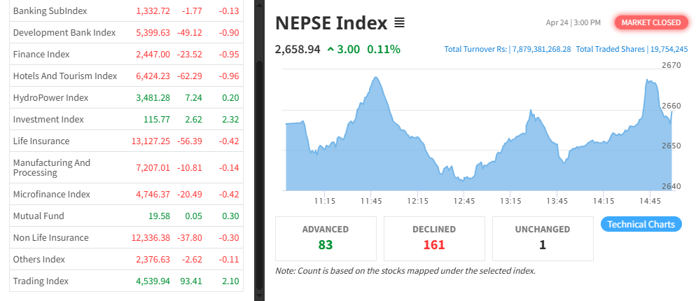 काठमाण्डौ । साताको अन्तिम कारोबार दिन नेप्से परिसूचक सामान्य अङ्कले बढेर कारोबार बन्द भएको छ । पछिल्ला ४ कारोबार दिन लगातार गिरावट भएको नेप्से...
