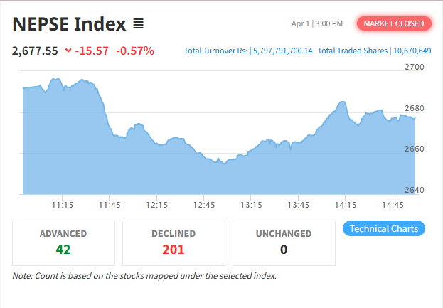 काठमाण्डौ । साताको पहिलो कारोबार दिन तथा वर्षकाे अन्तिम काराेबार दिन सेयर बजारमा गिरावट आएको छ । आइतबार बजार ८.९२ अंकले घटेको हो ।...